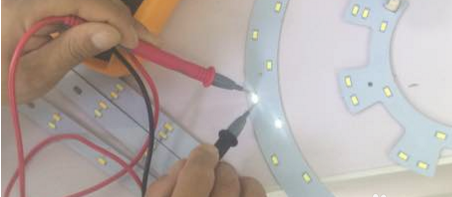 萬(wàn)用表紅筆與燈珠陽(yáng)極接觸體接觸, 萬(wàn)用表黑筆與陰極接觸體接觸。觀察是否亮燈。